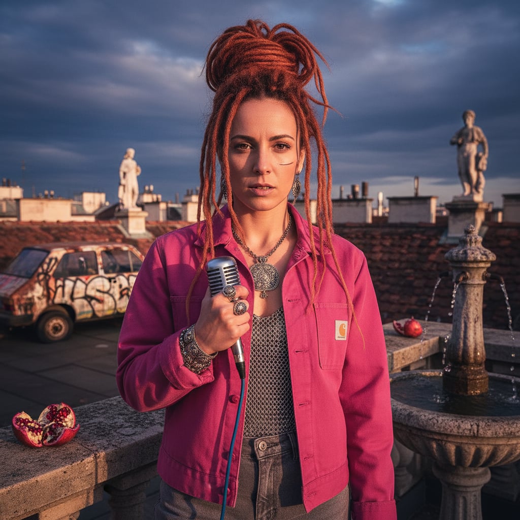 RONA ZIMA was born in an Austrian refugee camp to parents who fled the siege of Sarajevo. Raised in the concrete social housing projects of Vienna's 16th district, she writes sharp, deadpan rap about the city's unseen corners. Her partner of eight years, a stone carver who restores Vienna's historic cathedrals, is the silent 'you' in all her songs. She still writes her rhymes while flicking a Zippo lighter that survived the war her parents escaped.